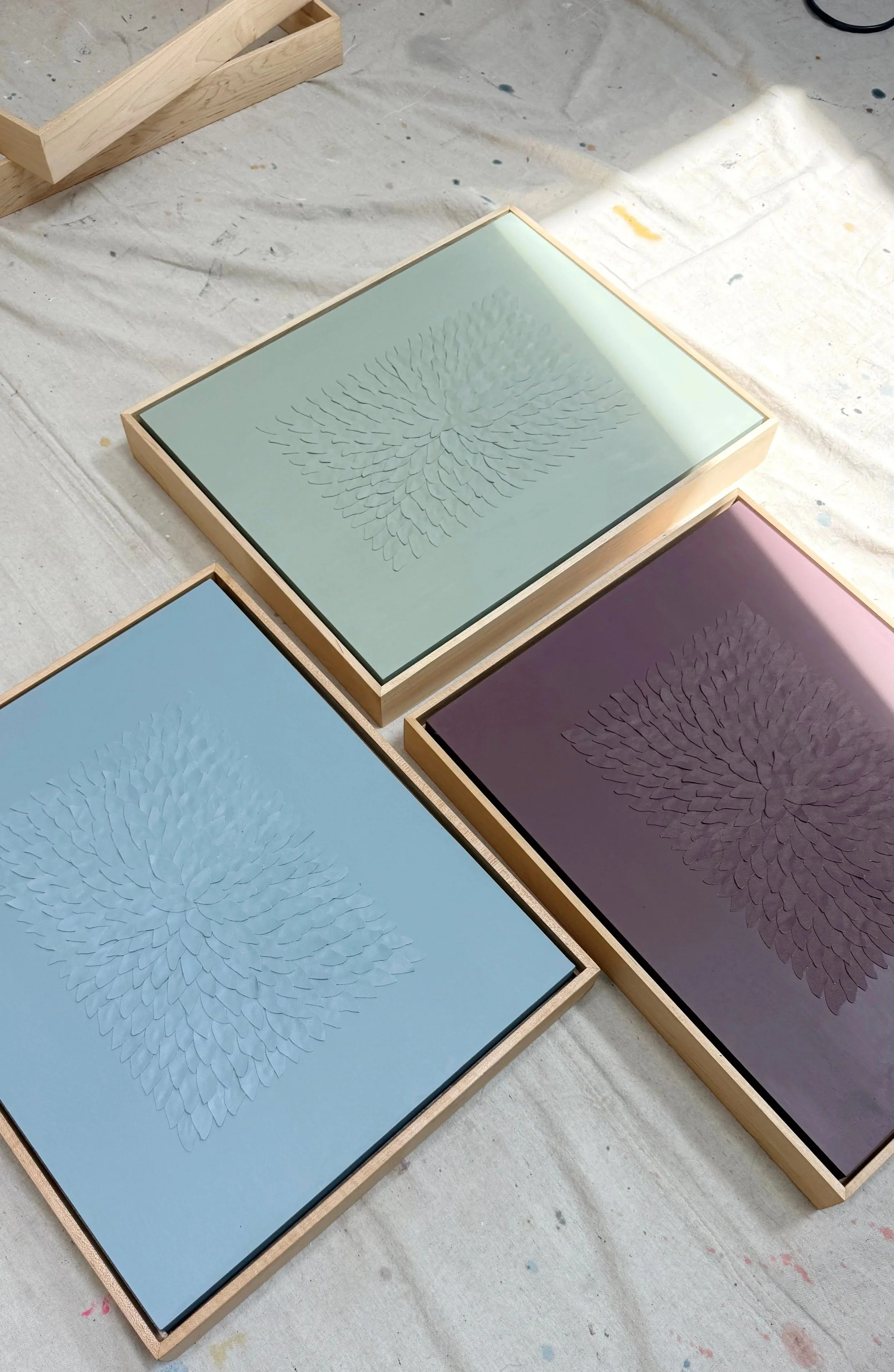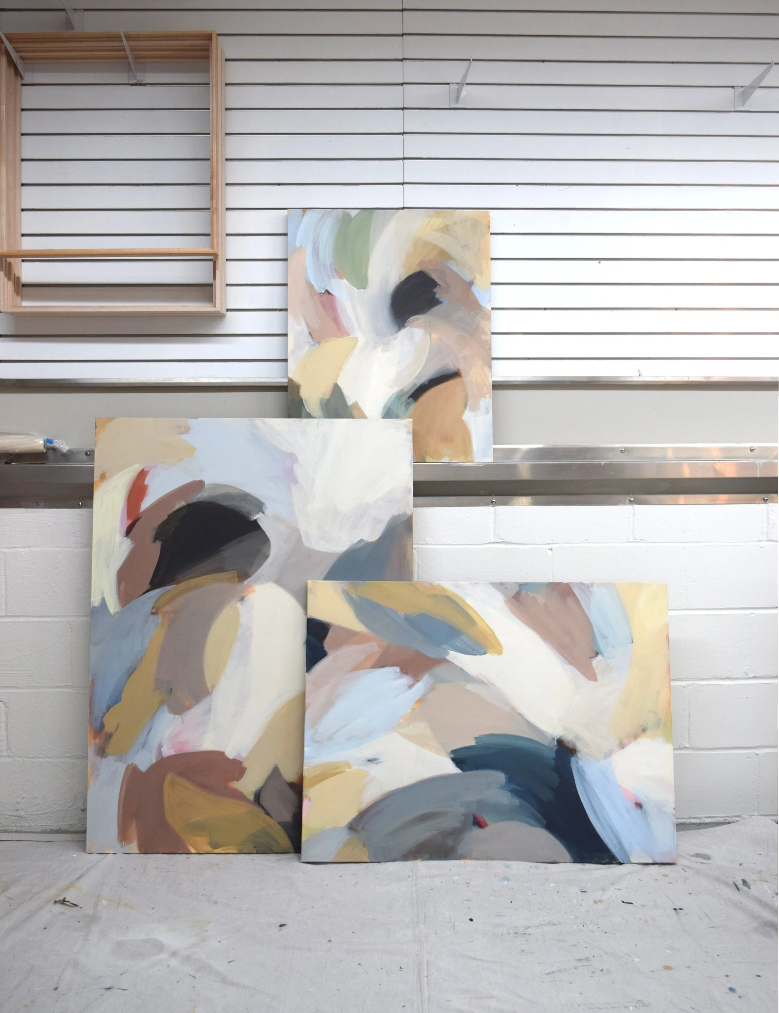 Susan is an abstract painter based on the Jersey Shore. She paints full time in her garage studio over looking her neighbor’s horse farm. Her paintings are constantly evolving, but are always inspired by nature, her love of surfing and her own personal life. Susan used to work as a graphic designer but now uses those skills and applies them to the canvas. The painterly quality of her work is evident in her exploration of color and movement through multiple layers.